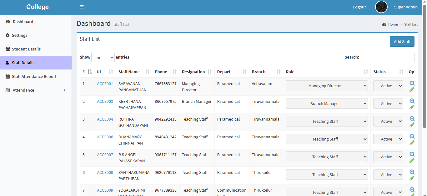 Super Admin - Manages entire college operations including student, staff, attendance, and reports.