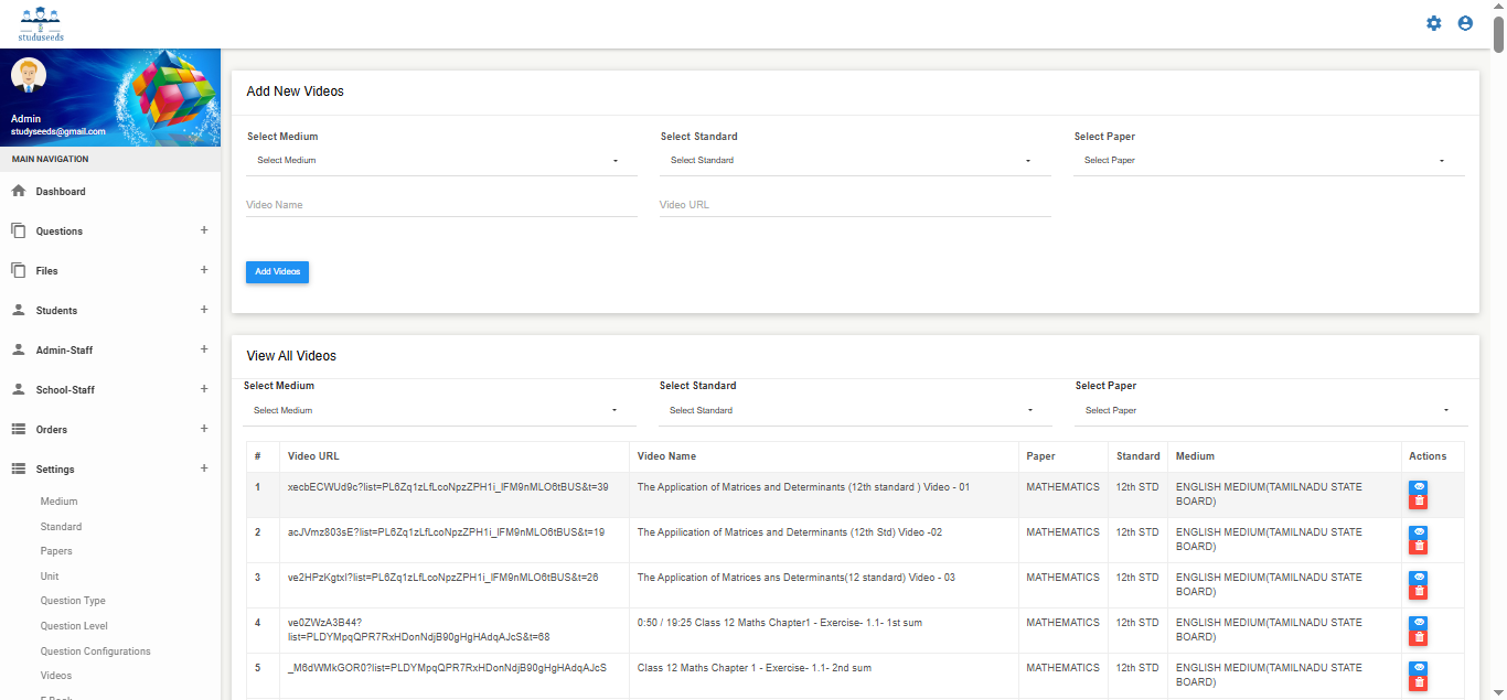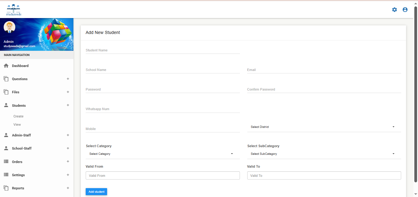 It is a comprehensive educational technology platform designed to streamline question bank management, exam paper generation, and academic assessment processes for schools and institutions. The system allows administrators to: Create and manage question banks Generate manual or automatic question papers Configure question types, levels, units, and syllabus Manage students and staff Provide digital learning resources such as videos, e-books, and teacher materials Generate detailed test reports and analytics With customizable academic settings (medium, standard, subject, test type, academic year), Studyseeds enhances assessment accuracy, reduces manual effort, and improves overall academic performance tracking. This system is ideal for schools, coaching centers, and educational institutions.