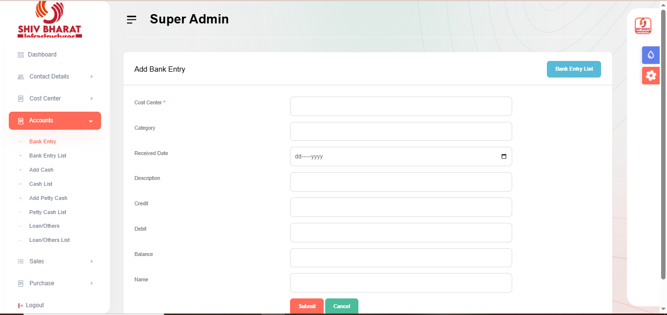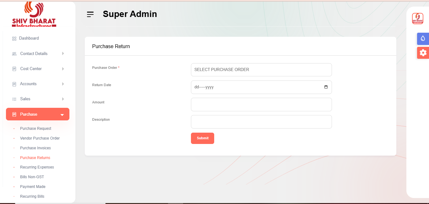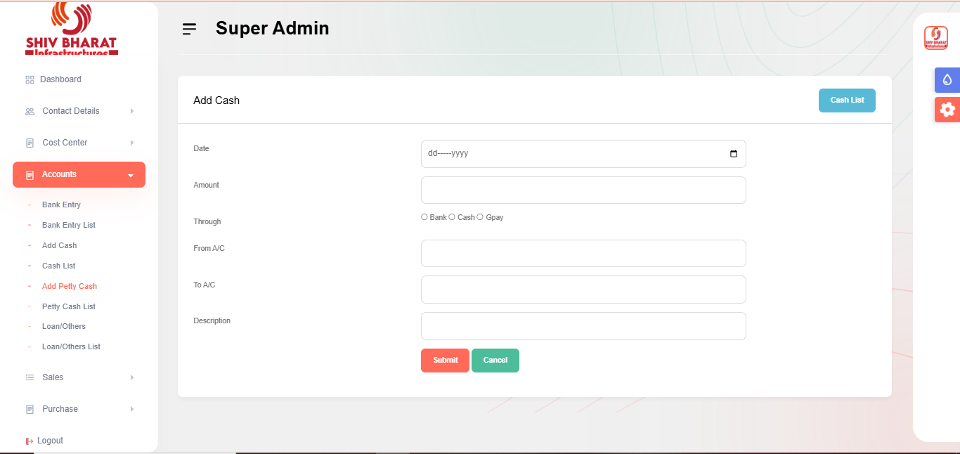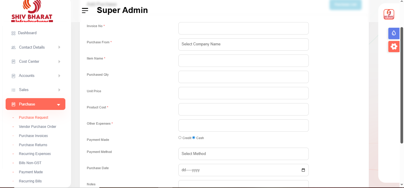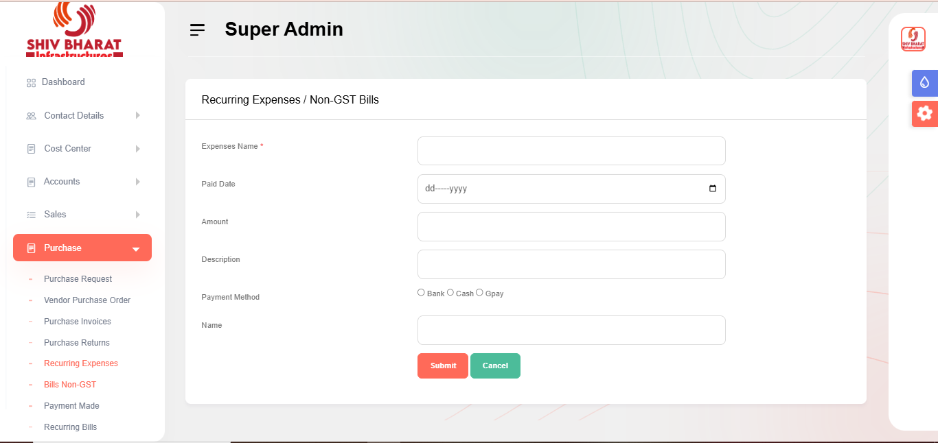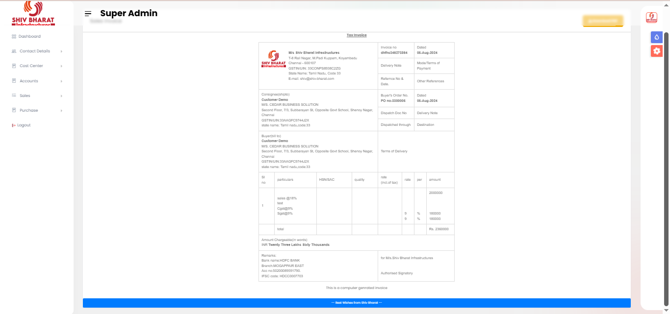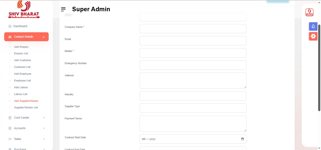 The Infrastructures ERP System is a comprehensive enterprise solution developed to streamline construction and infrastructure business operations. The system integrates contact management, employee and labour tracking, supplier management, cost center monitoring, asset management, banking transactions, petty cash handling, sales and purchase workflows, GST billing, vendor payments, and recurring expense tracking. With multi-role login access for Admin, Supplier, and Employees, the system ensures structured workflow management, financial transparency, and operational efficiency across projects.