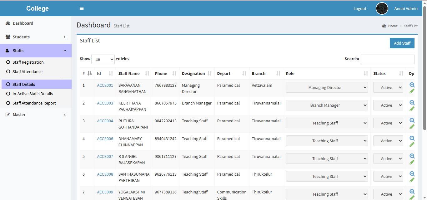 Super Admin - Manages entire college operations including student, staff, attendance, and reports.
