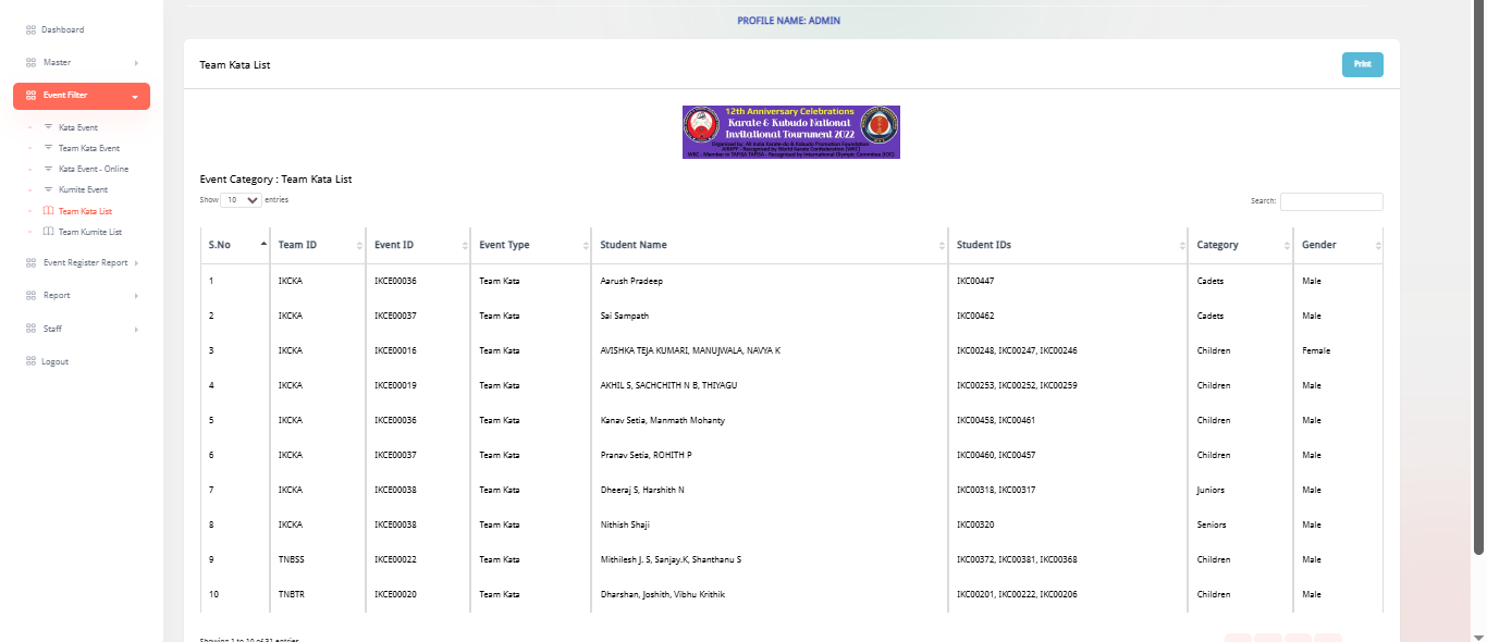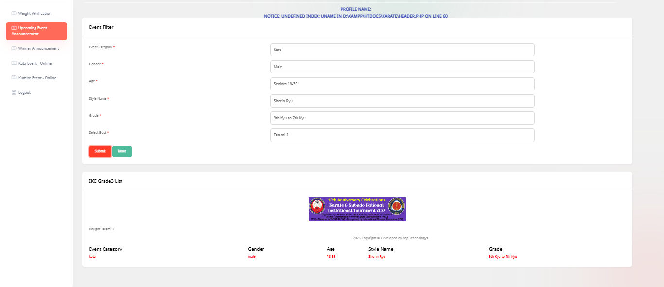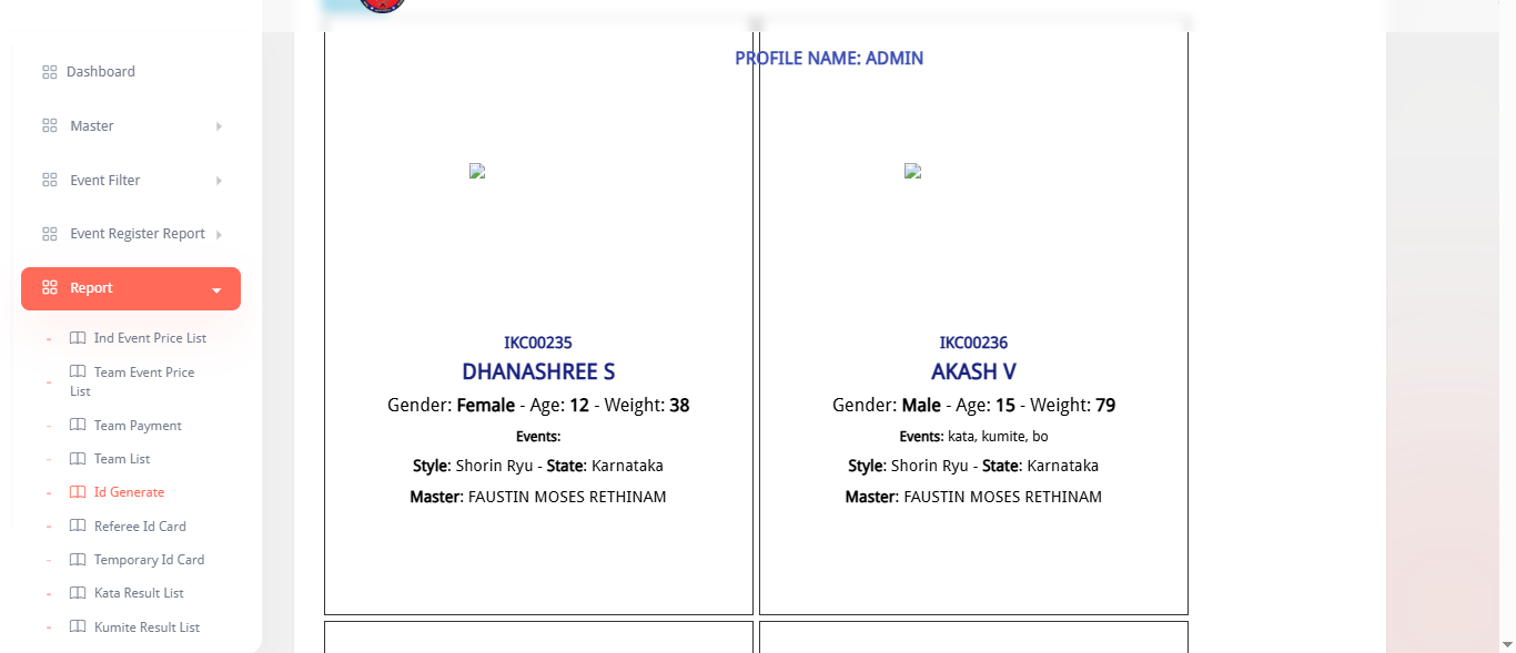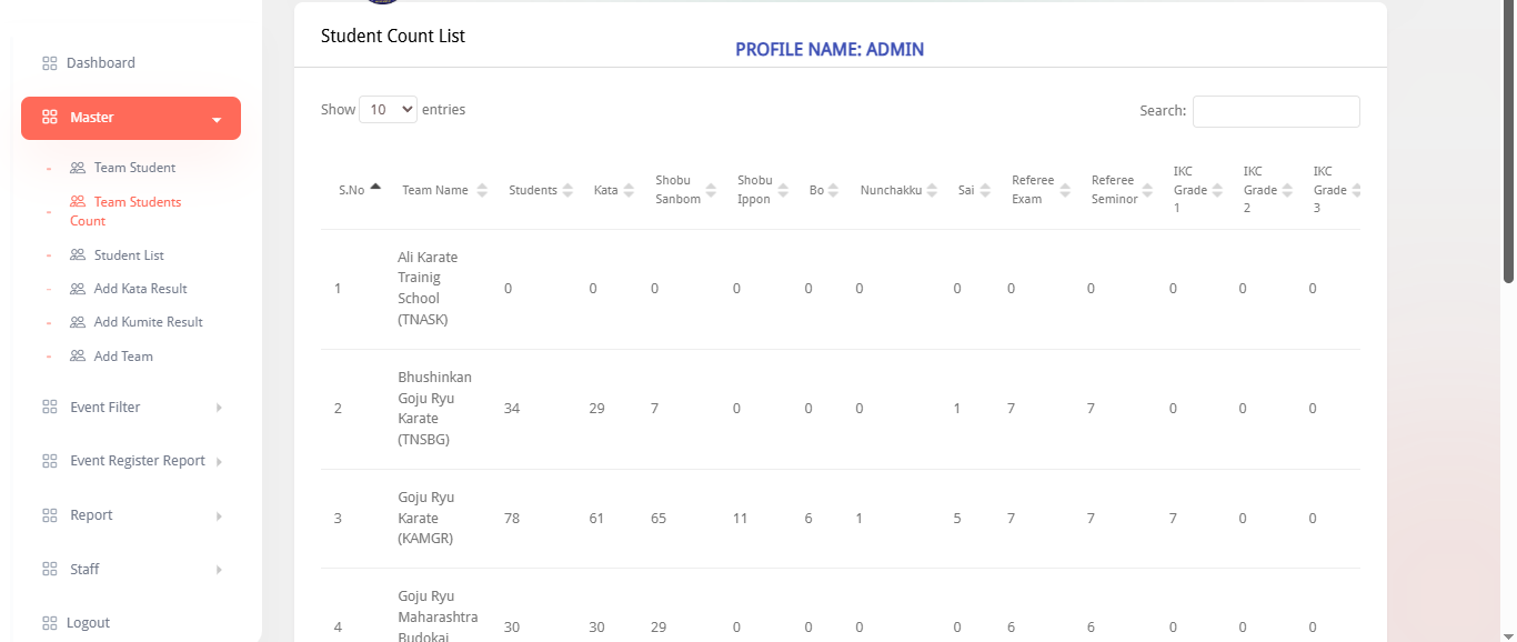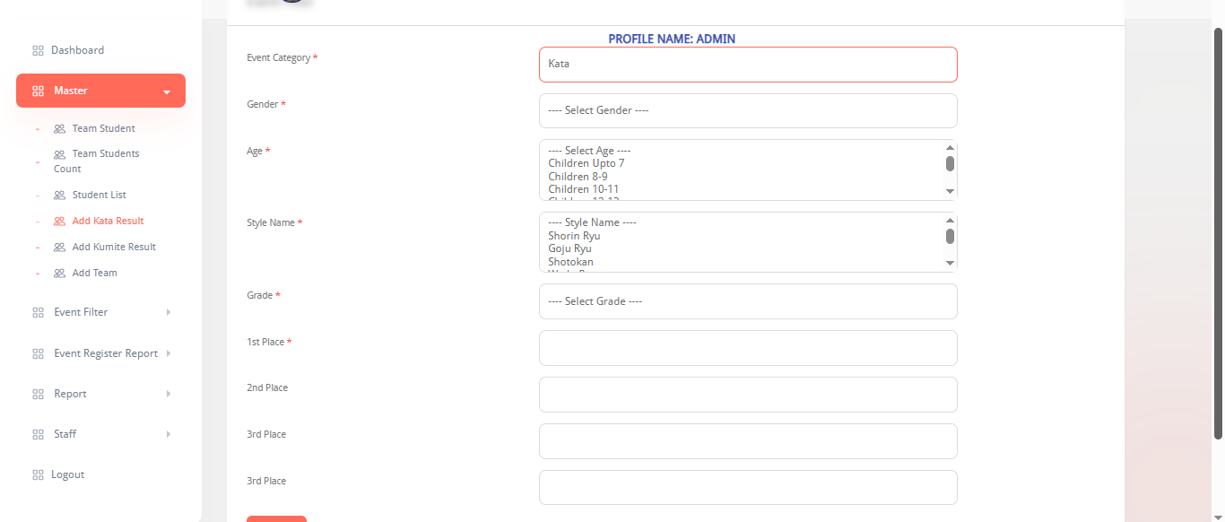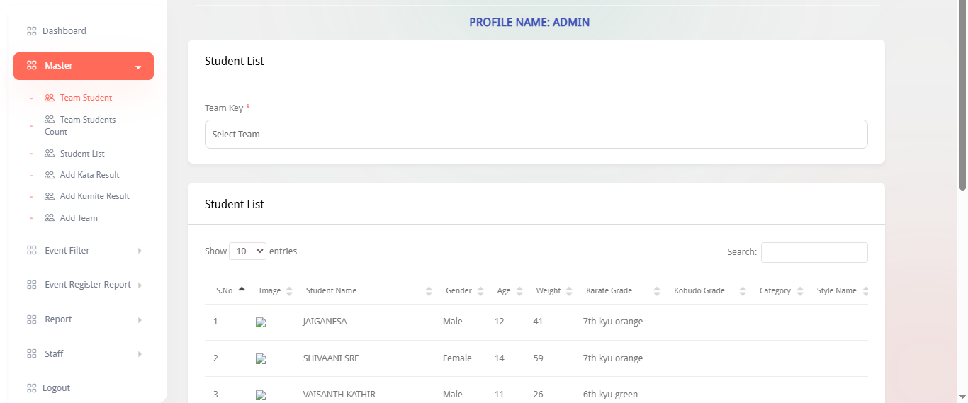 This system is designed to fully digitalize karate tournament management, allowing admins, teams, students, and staff to manage every part of the event process. Admins can handle students, teams, kata/kumite scoring, event registrations, payment tracking, ID cards, reports, and winner statistics. Teams can register students, manage event entries, and track payments. Students can view their profiles and event details, while staff manage weight checks, event announcements, and live scoring boards. The platform ensures accurate scoring, fast registrations, transparent results, and smooth coordination throughout the karate championship.