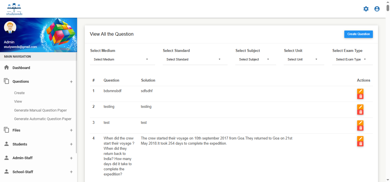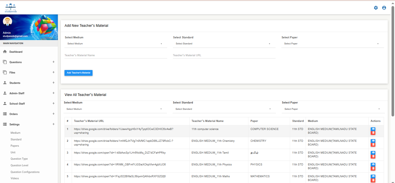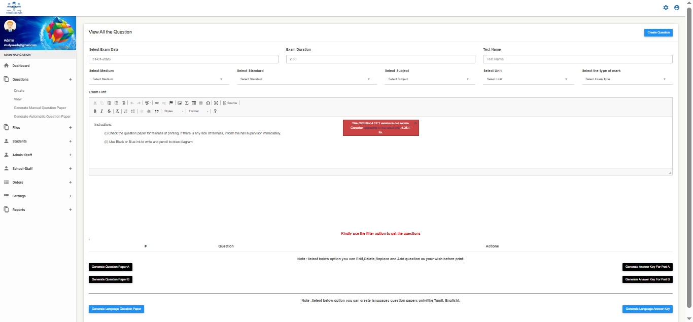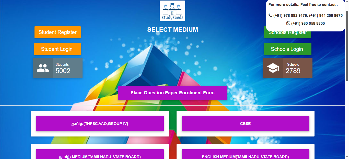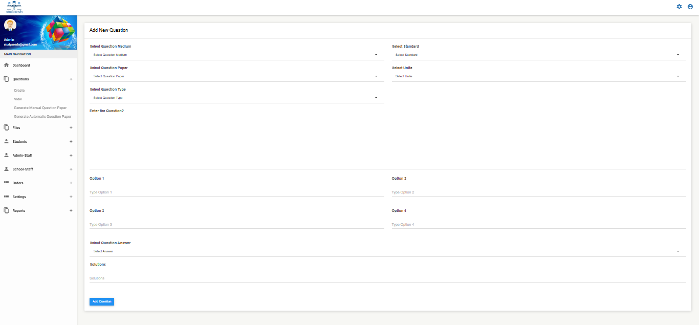 It is a comprehensive educational technology platform designed to streamline question bank management, exam paper generation, and academic assessment processes for schools and institutions. The system allows administrators to: Create and manage question banks Generate manual or automatic question papers Configure question types, levels, units, and syllabus Manage students and staff Provide digital learning resources such as videos, e-books, and teacher materials Generate detailed test reports and analytics With customizable academic settings (medium, standard, subject, test type, academic year), Studyseeds enhances assessment accuracy, reduces manual effort, and improves overall academic performance tracking. This system is ideal for schools, coaching centers, and educational institutions.