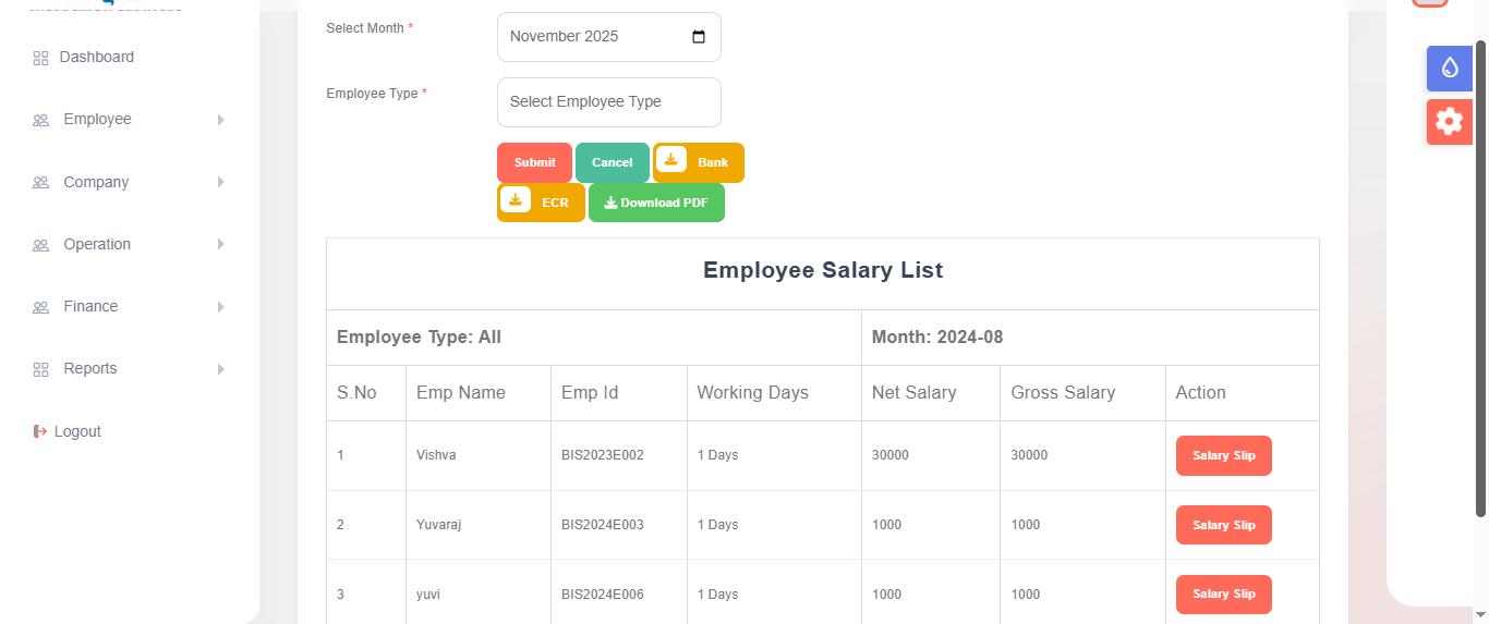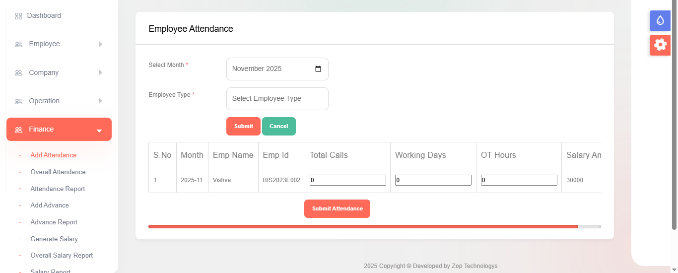 Finance Module - Manages payroll, attendance, advances, invoices, and reports.
